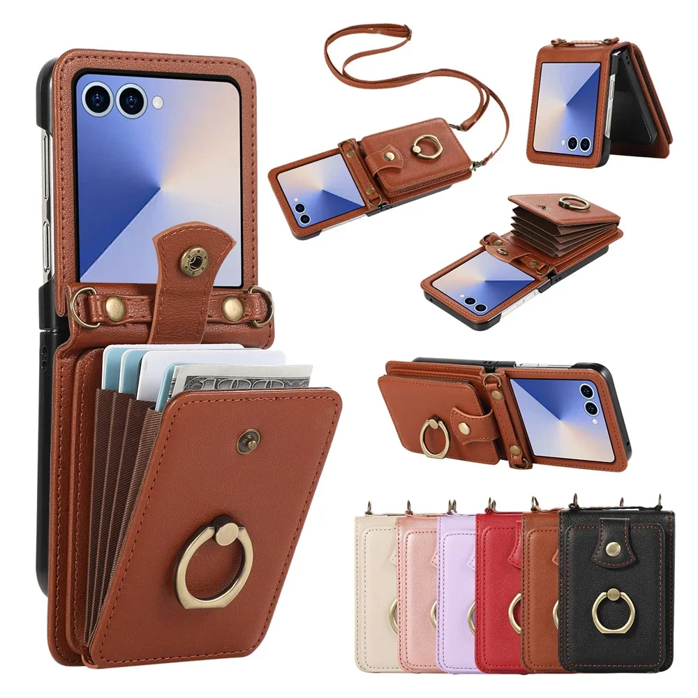 Leather Wallet Phone Case for Samsung Galaxy Z Flip 7 6 5 4 3 Flip7 FE with Finger Ring Card Holder and Crossbody Strap