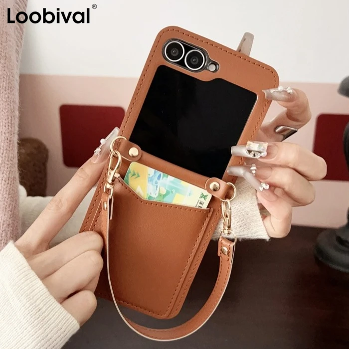 Wallet Card Insertion Leather Wrist Strap Case For Samsung Galaxy Z Flip6 Zflip5 Z Flip 3 4 Fashion Photo Clip Shockproof Cover