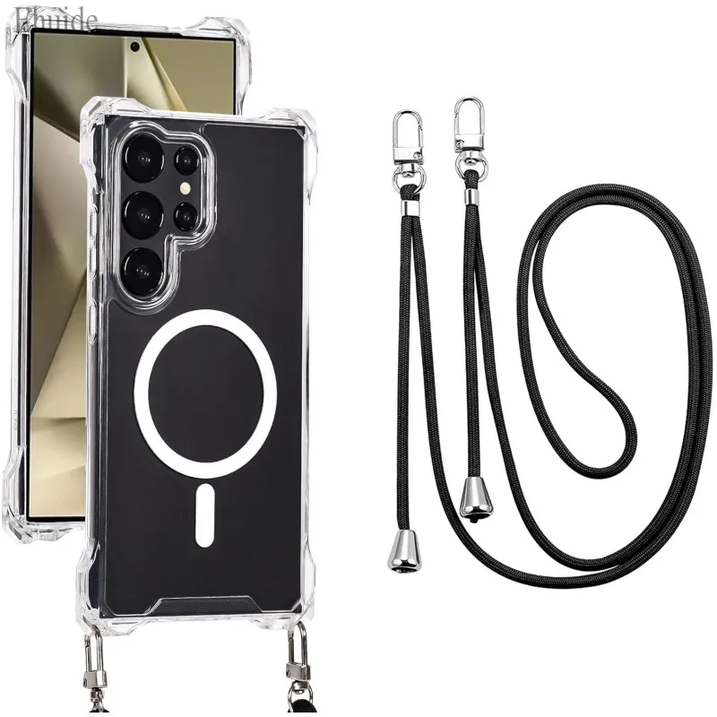 Shockproof Strap Case For Samsung Galaxy S25 S24 Ultra S23 Plus Magnetic Crossbody Lanyard Cord Rope Transparent Clear Cover