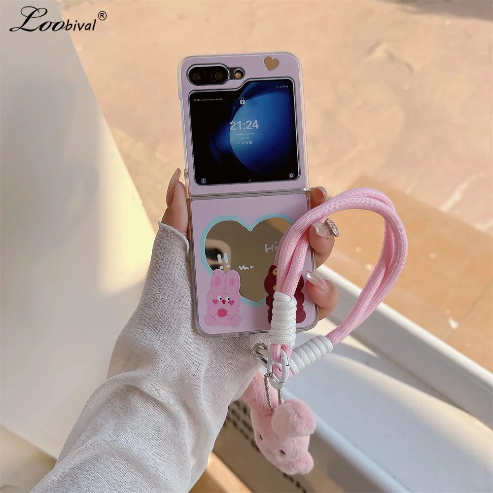 Cute Cartoon Rabbit Mirror Wrist Strap Case for Samsung Galaxy Z Flip 6 5 4 3 flip6 Cat Love Heart Make Up Lanyard Hard Cover