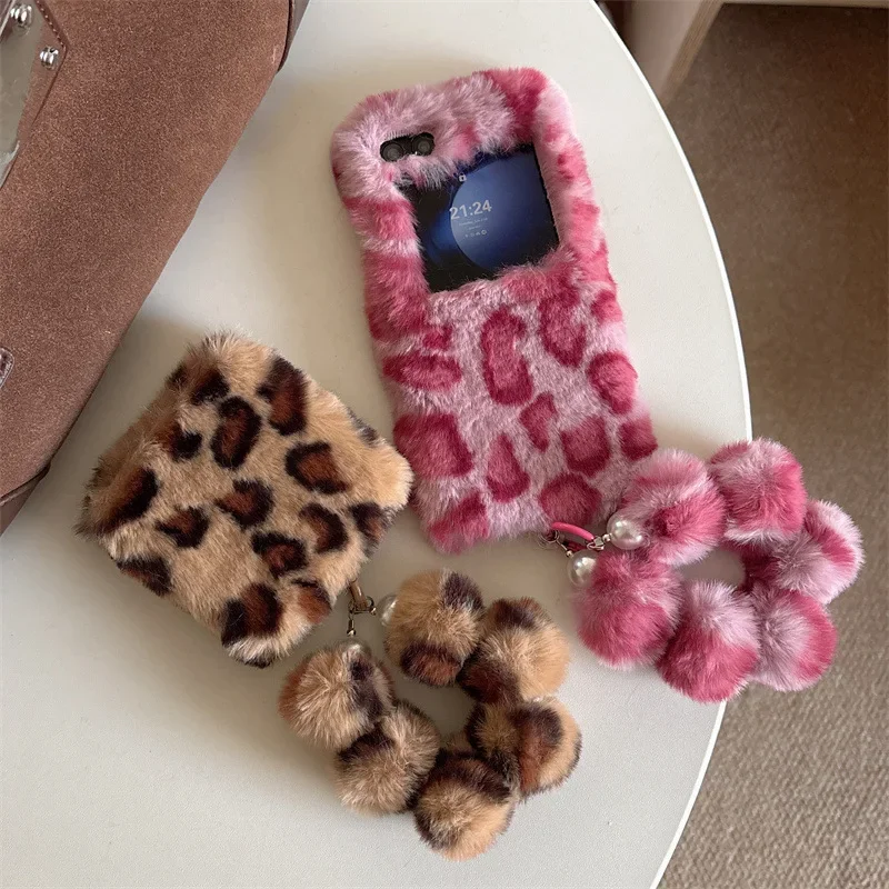 Cute Leopard Print Fluffy Plush With Wrist Strap Bracket Phone Case For Samsung Galaxy Z Flip 7 6 5 4 3 Zflip7 Shockproof Cover