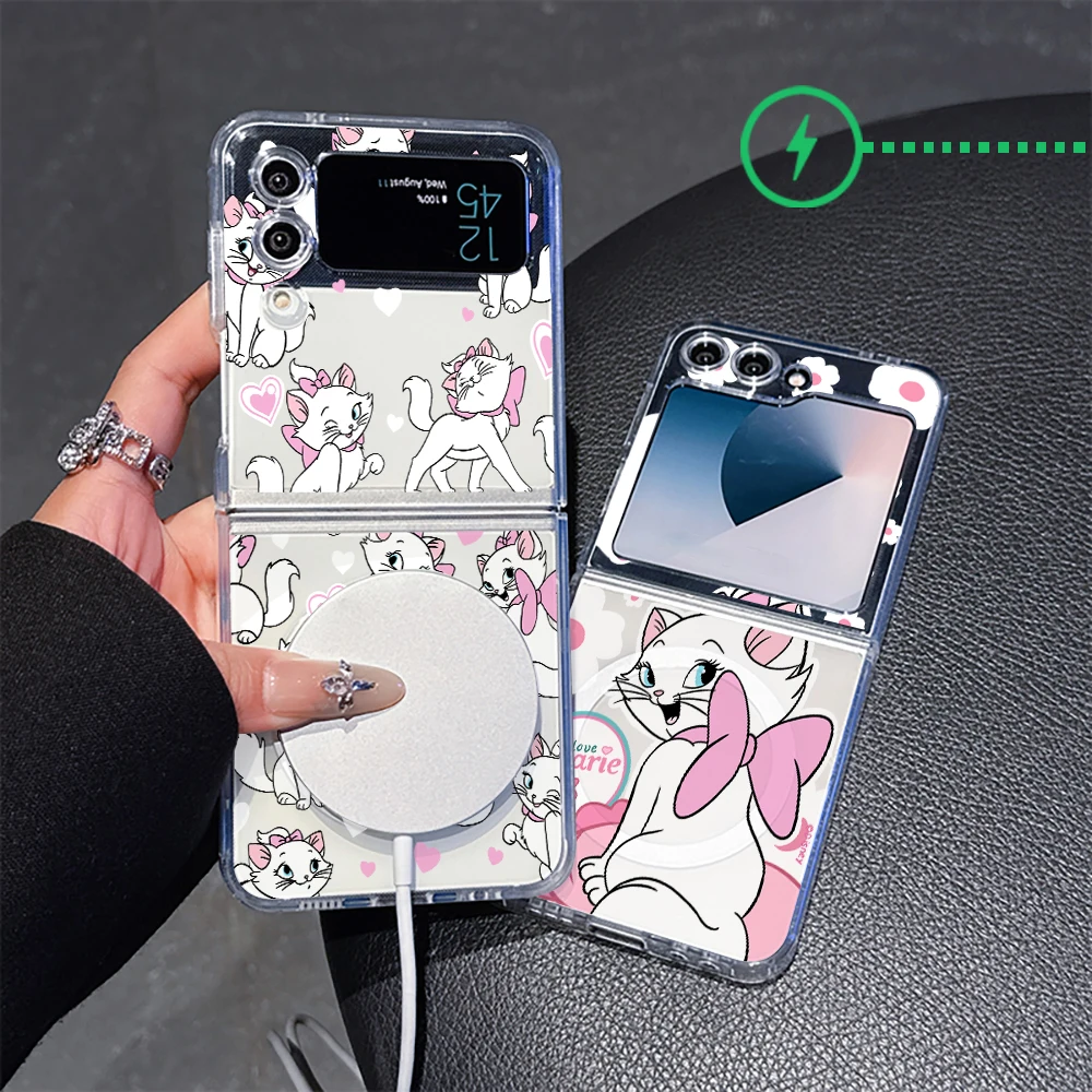 Lovely Marie Cat Wireless Charge For Magsafe Magnetic Phone Case for Samsung Galaxy Z Flip 6 5 ZFlip 4 3 Flip6 Flip5 5G Cover