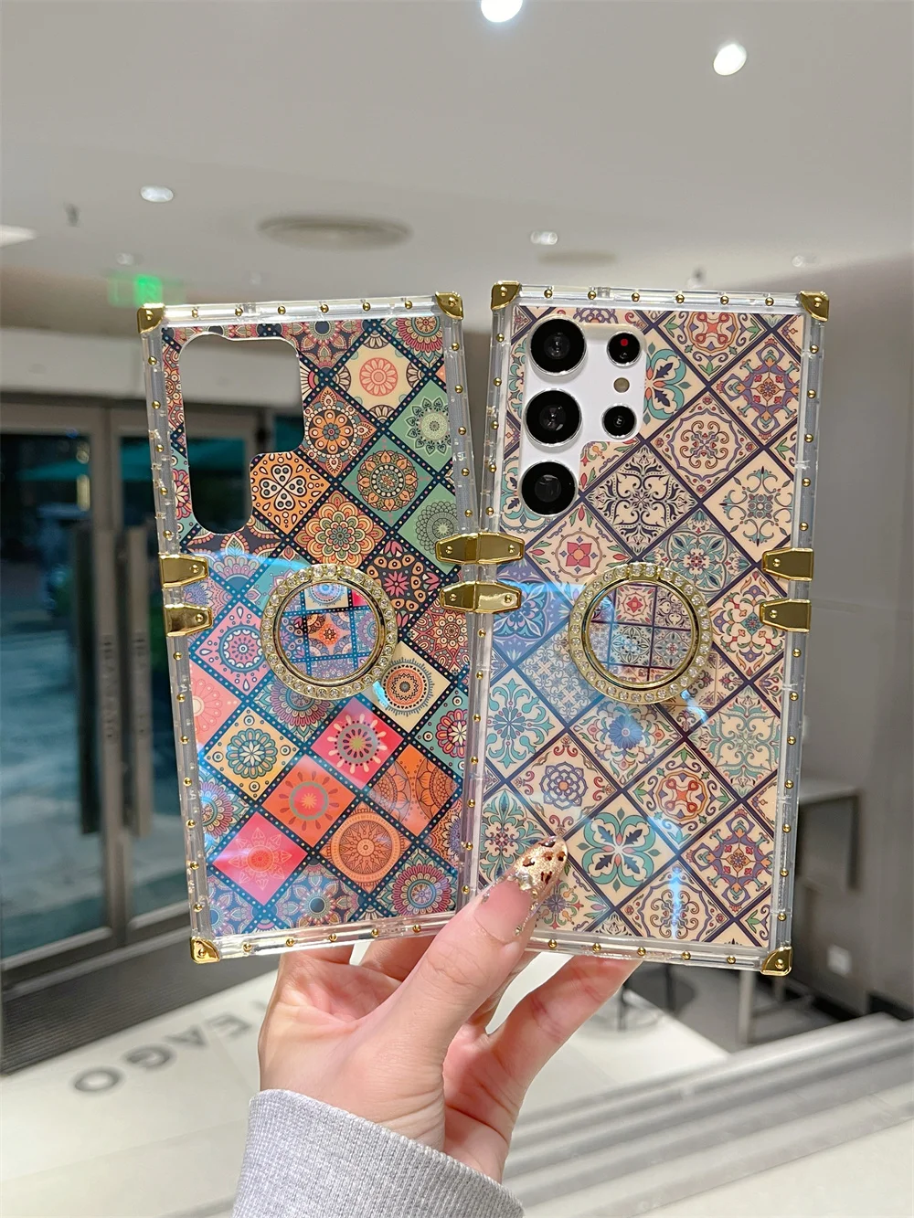 Gold Plating Bumper Ethnic Flower Case for Samsung Galaxy S25 Ultra S24FE S23 Plus Finger Ring Geometry Plaid Pattern Cover  Read more