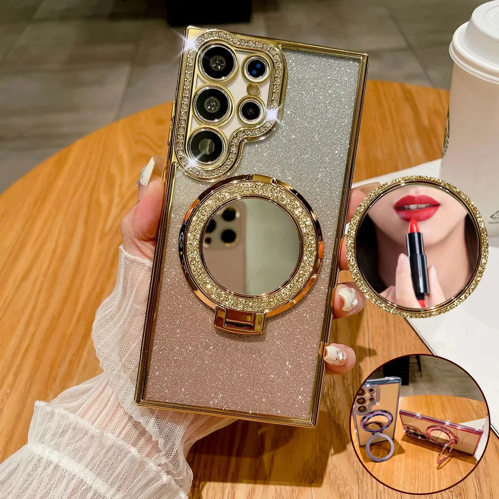 Luxury Diamond Clear Glitter Magsafe Case For Samsung Galaxy S25 S24 Ultra S23 S22 Plus Mirror Magnetic Phone Holder Stand Cover