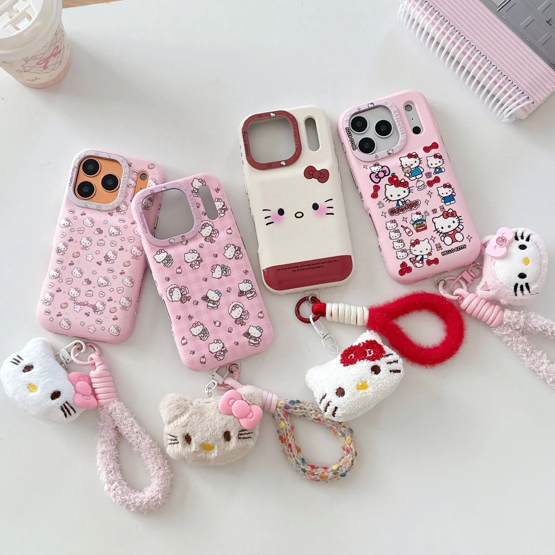 Full screen Cartoon Cute HelloKitty Soft Bread Silicone Leather Phone Case For iPhone 17 16 15 14 Pro Max KT Doll furry Lanyard