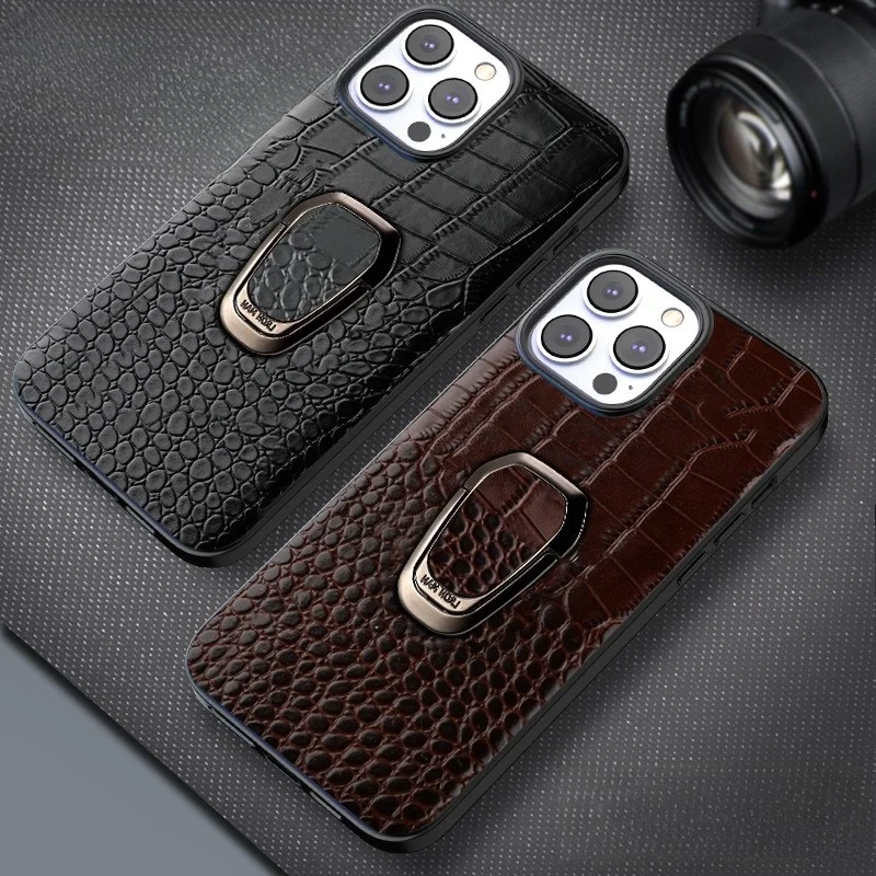 Genuine Cowhide Leather Bracket Phone Case for iPhone 16 15 14 13 12 11 Pro Max XR XS Max SE 2022 7 8 Plus Back Cover with Ring