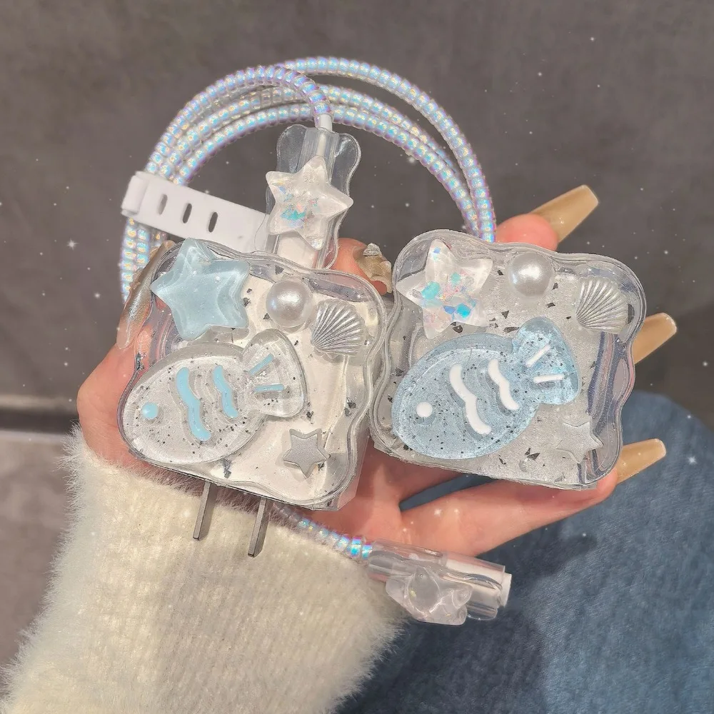 Cute 3D Shell Fish Star Wave Border Epoxy USB Protector Cover For iPhone 18W-20W Data Line Head Cord Fast Charging Case