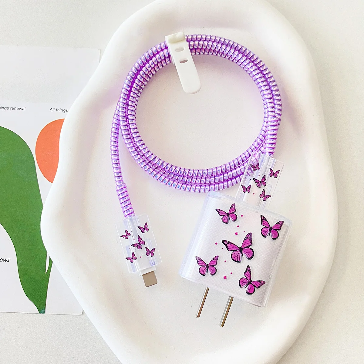 Sliver Colorful Butterfly Charger Case For iPhone 20W Fast USB Data Cable Protective Case Winder Organizer Prevent Line Breakage