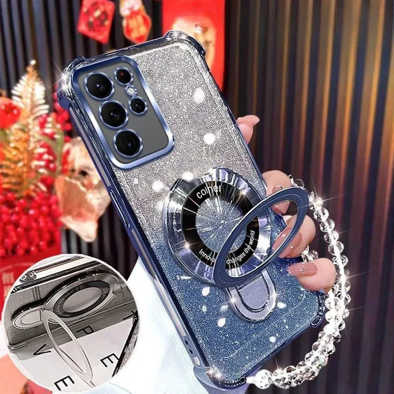 For Samsung Galaxy S25 Edge S24 S23 S22 S21 S20 Ultra FE Plus 5G Case Shockproof Glitter Plating Magnetic Holder Bracelet Cover