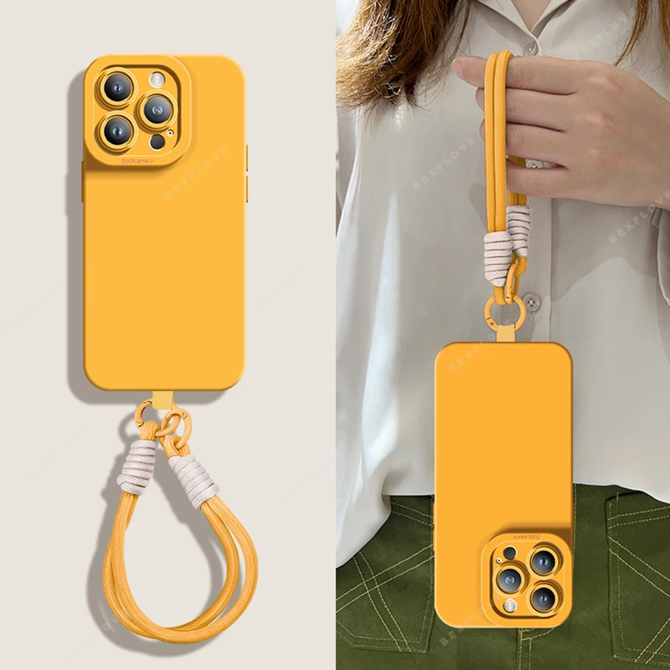Liquid Silicone Phone Case For iPhone 16E 14 15 16 Plus 12 11 13 Pro Max Mini X XR XS MAX Lanyard Hand Wrist Strap Soft Cover