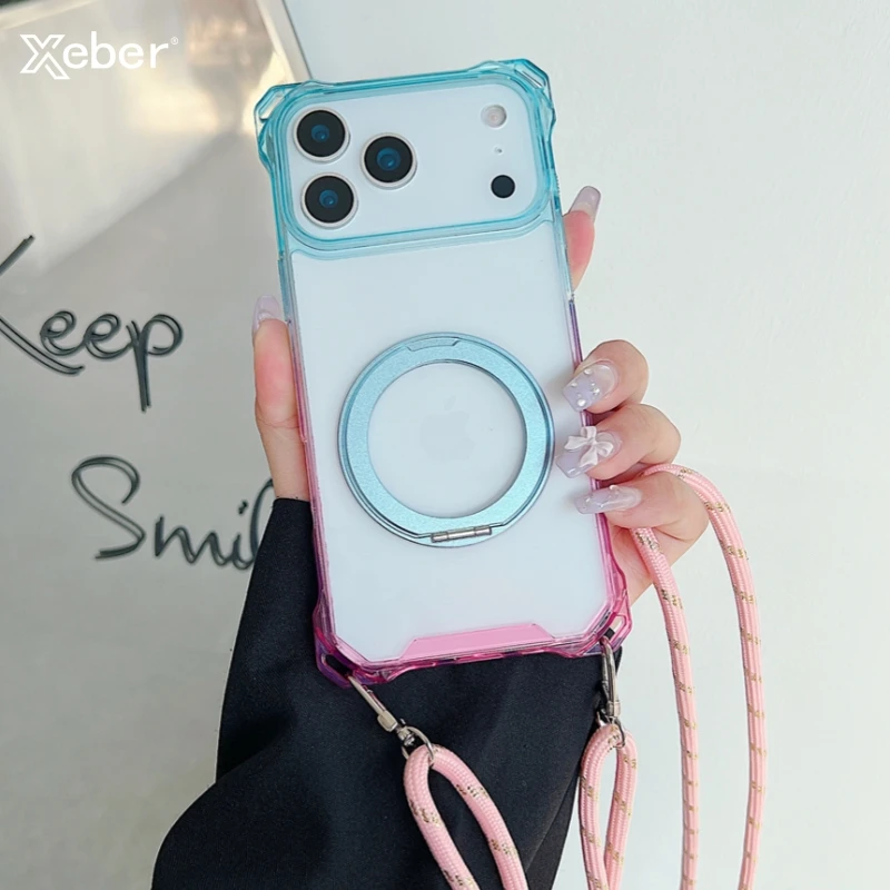 Metal Magnetic Holder Gradient Case For iPhone 17 16 15 14 13 12 11 Pro Max Plus 360 Rotation Ring Crossbody Lanyard Strap Cover