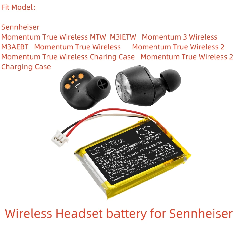 Li-Polymer Wireless Headset Battery for Sennheiser, 3.7V, 500mAh, Compatible Models: M3AEBT, M3IETW, Momentum 3 Wireless