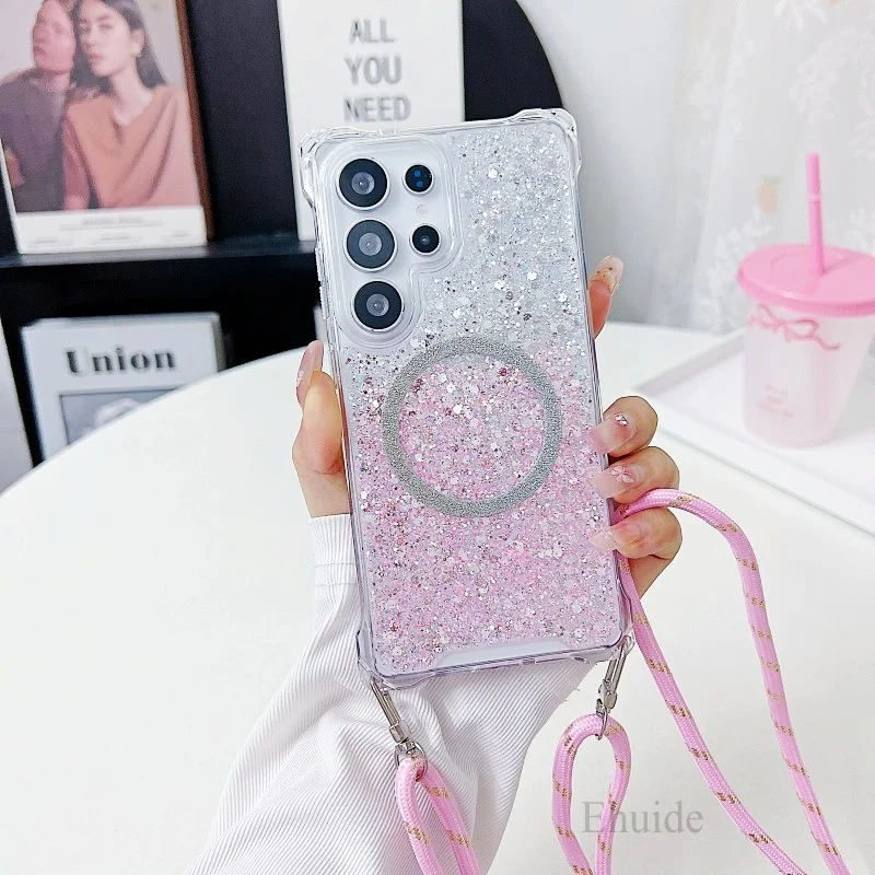 Glitter Case For iPhone 17 16 Pro Max 16E 12 13 15 Plus 14 Pro Magnetic Crossbody Lanyard Four Corners Shockproof Strap Cover