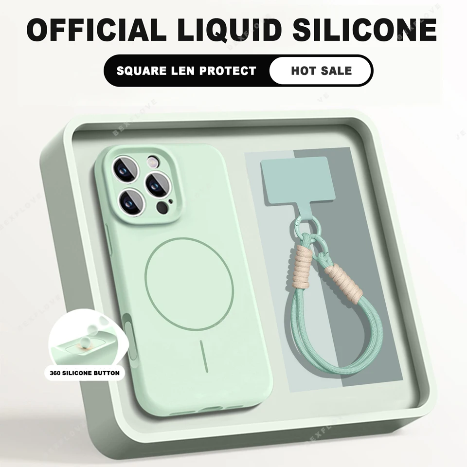 Official Liquid Silicone Lanyard Strap Rope Case For iPhone 17 16E 16 14 15 Plus 12 13 11 Pro Max Magsafe Magneitc Soft Cover