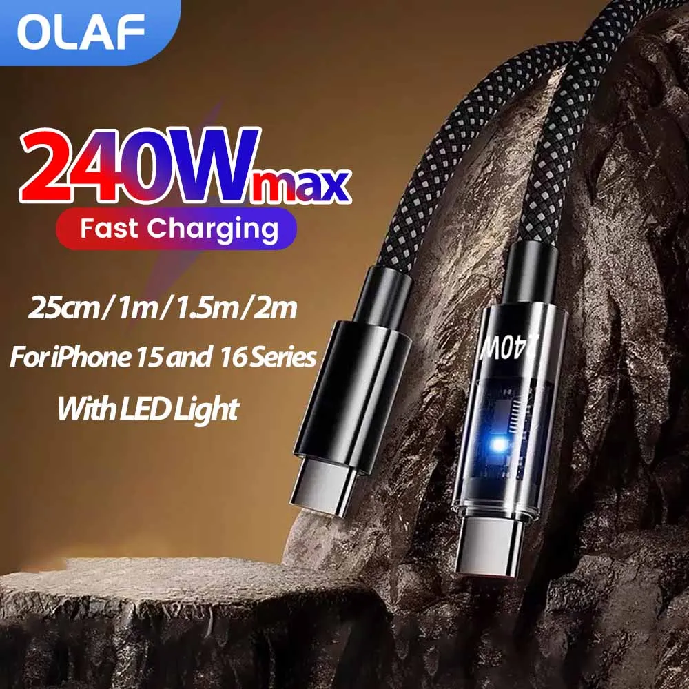 240W 6A USB to Type C Super Fast Charging Cable 25cm-2m LED PD C to C Mobile Phone Data Cable For iPhone 15 16 Samsung Xiaomi