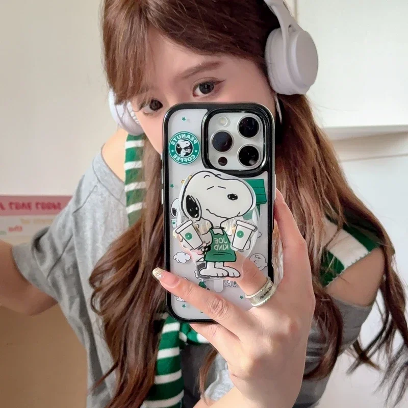 Cute Cartoon Snoopy Charlie Brown Magnetic Holder Magsafe Wireless Charge Phone Case For iPhone 16 15 14 13 Pro Max Hard Cover
