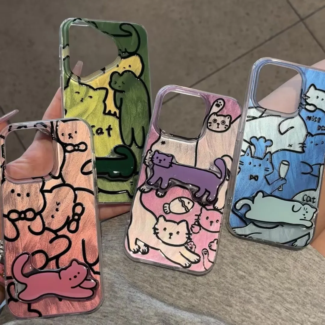 Compatible for IPhone 14 15 13 16 12 11 Pro Max 15 16 14 Plus Simple Wave Point Cartoon Cute DIY Cat Doll Leather Texture Case