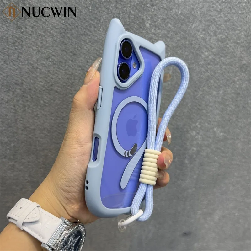 Cute Cat Ear Transparent Magnetic Wrist Strap Case For iPhone 17 16 15 14 12 13 Pro Max 11 17 Air Wireless Charge Lanyard Cover