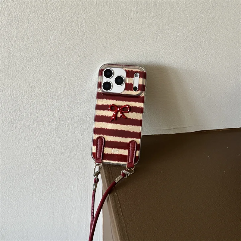 New pink striped butterfly Phone Case For iPhone 17 Pro 16 15 14 Pro Max Grey Cover Lanyard Shockproof Cute Cases For Girls