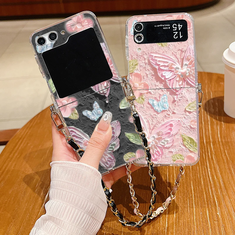 Floral Printed Metal Lanyard Clear Case For Samsung Galaxy Z Flip 7 6 5 4 3 5G Flip5 Flip6 Flip4 Flip3 Soft TPU Folding Cover  Read more