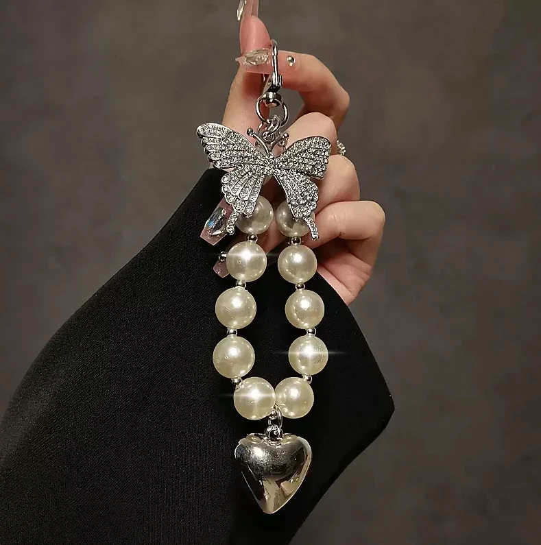 Luxury Butterfly Pearl Beaded Keychain Bracelet Lanyard Phone Charm Cute Love Heart Mobile Phone Camera Wrist Strap Anti-Lost