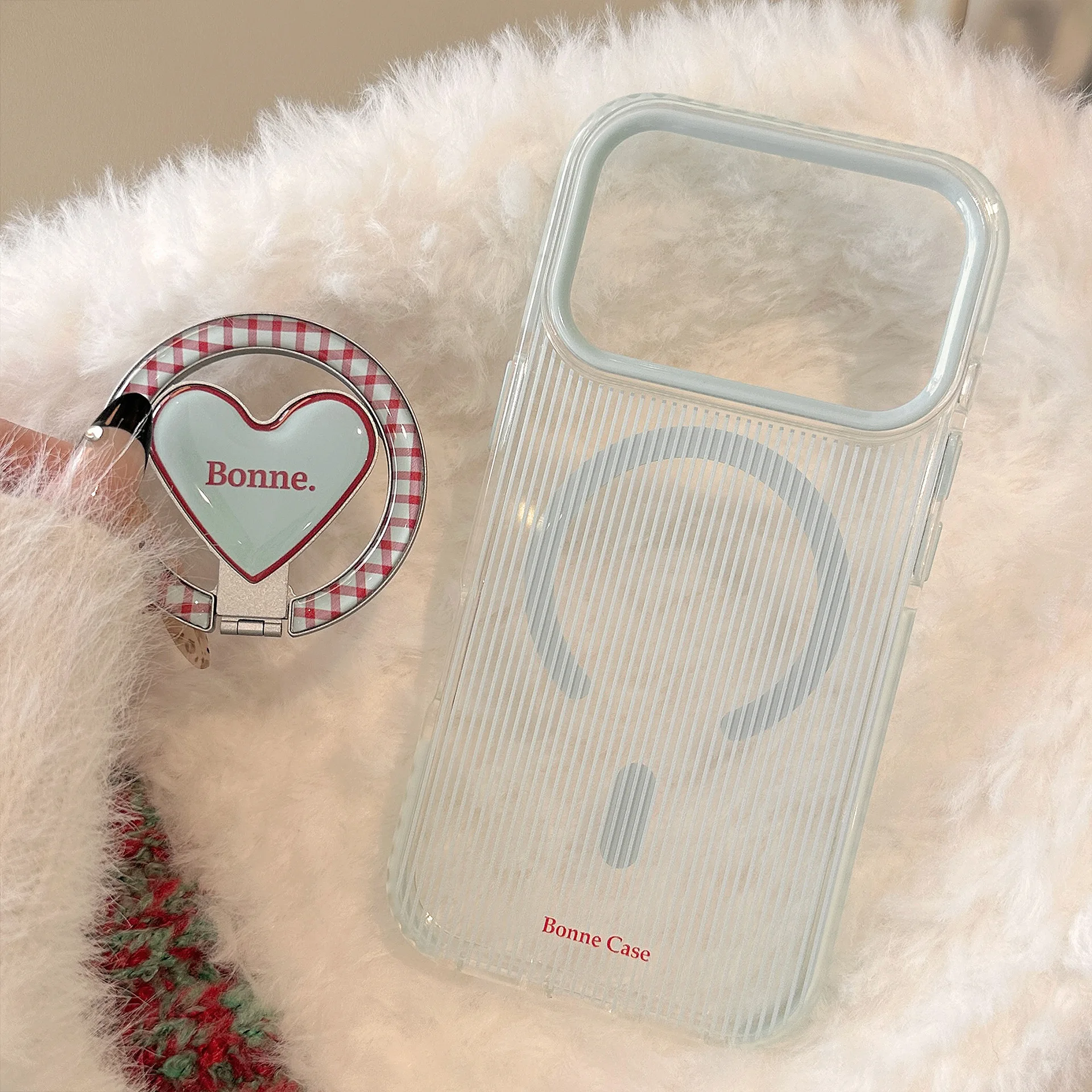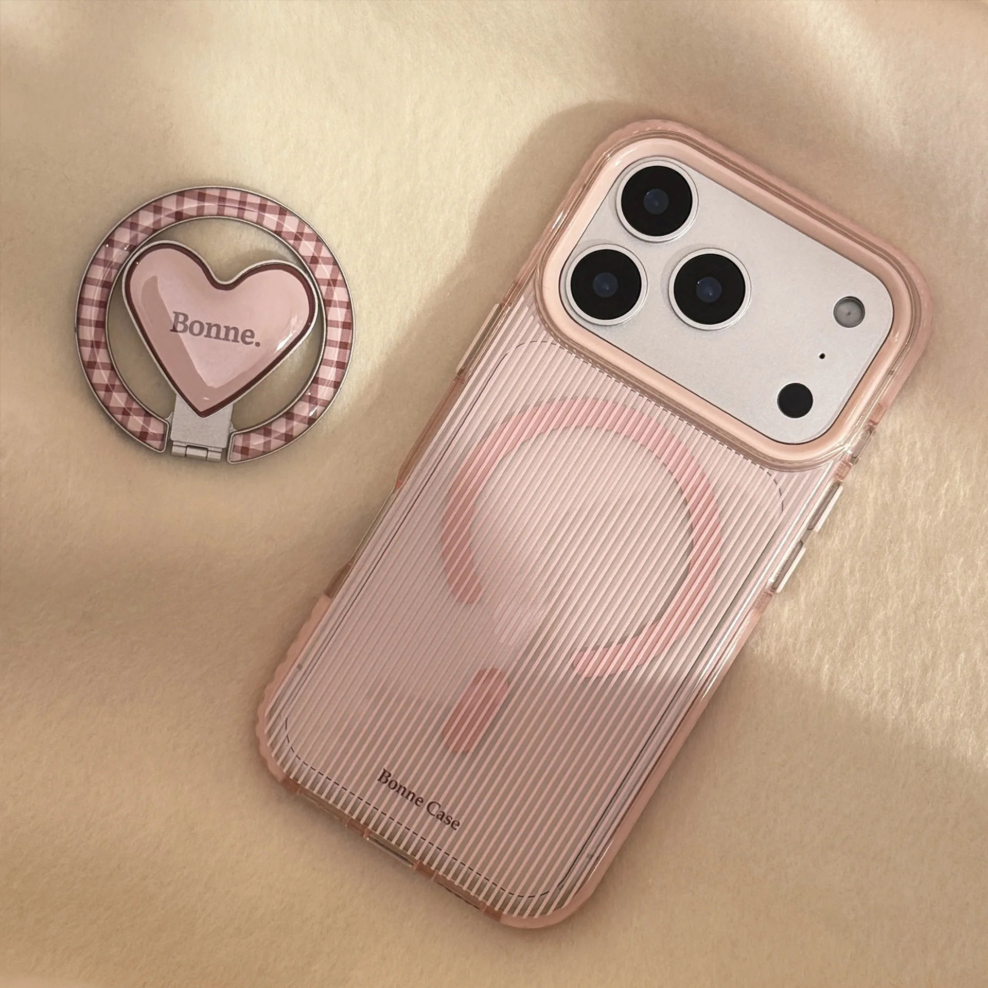 Korean Pink Striped With Plaid Love Heart Bracket Magnetic Phone Case for iPhone 17 16 15 14 13 12 Pro Max Shockproof Soft Cover