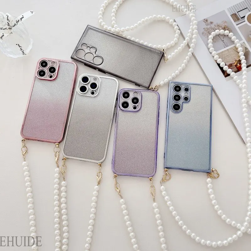 Lanyard Case For iPhone 15 16 Pro Max 11 12 13 Mini 14 Plus X XS XR Crossbody Strap Cord Pearl Clear Plating Glitter Soft Cover