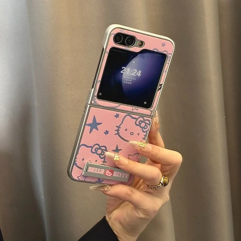 Cute Sanrio Y2K Hello Kitty Silver Plating Bling Glitter Phone Case For Samsung Galaxy Z Flip 6 5 4 3 Cover With Hide Stand