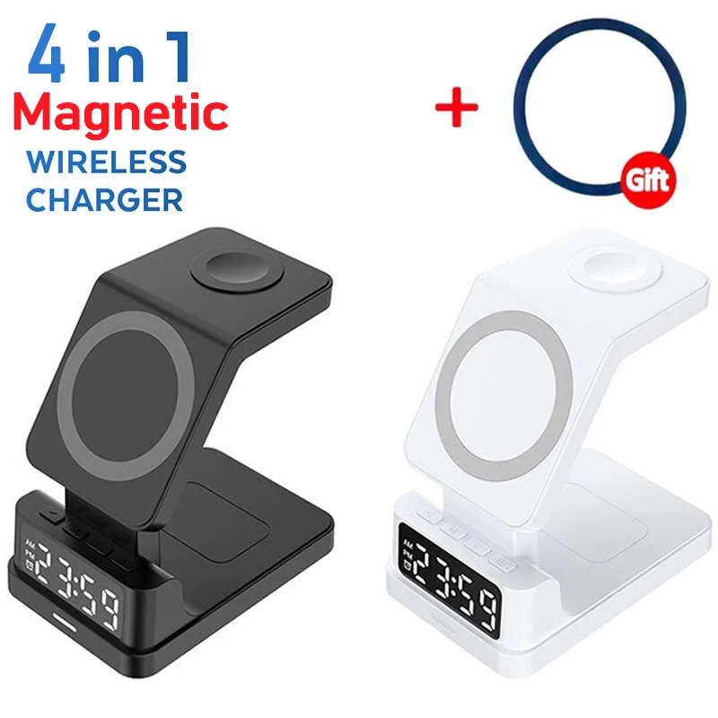 4 In 1 30W Magnetic Wireless Charger Stand Alarm Clock Fast Charging Station For Iphone 15 14 13 12 Apple Watch 8 7 Airprods Pro