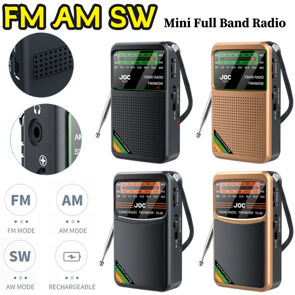 Portable Mini Full Band Radio FM AM SW Radio Built-in Speaker Battery Operated Radio Type-C Rechargeable for Senior Home Walking
