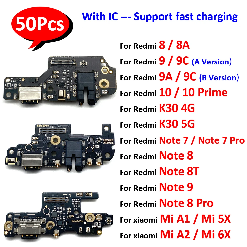 50Pcs,USB Charging Socket Port Connector Board Flex For Xiaomi Mi A1 A2 Redmi 10 Prime 10C 8 8A 9A 9 9C K30 5G 4G Note 7 Pro 8T