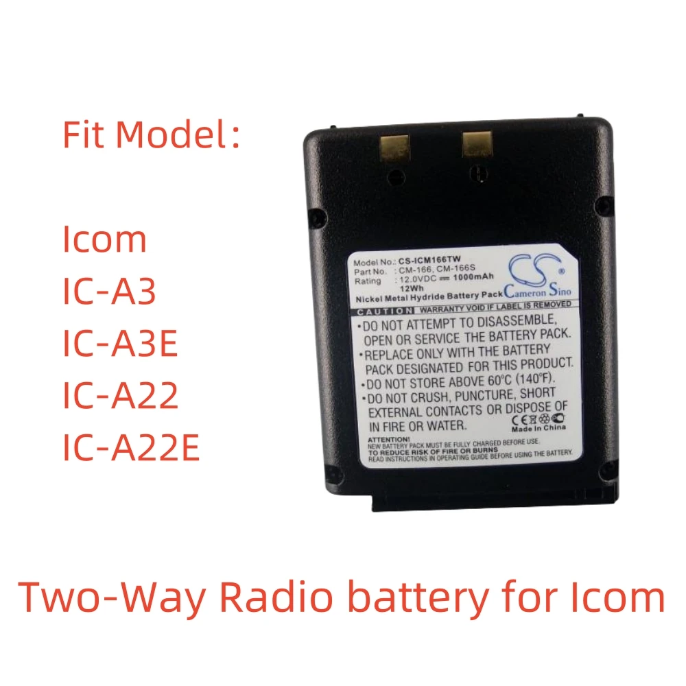Ni-MH Two-Way Radio Battery for Icom, 12.0V, 1000mAh, Compatible Models: IC-A22, IC-A22E, IC-A3, IC-A3E