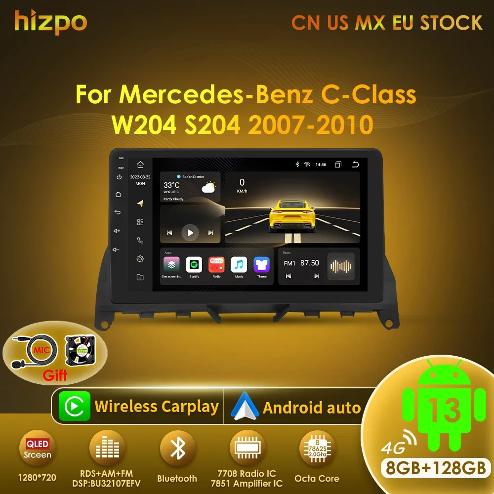 Hizpo 1280x720 Android 13 DSP RDS Car Auto Radio Multimedia Video Player for Mercedes Benz W204 C Class S204 2007-2010 GPS 2din