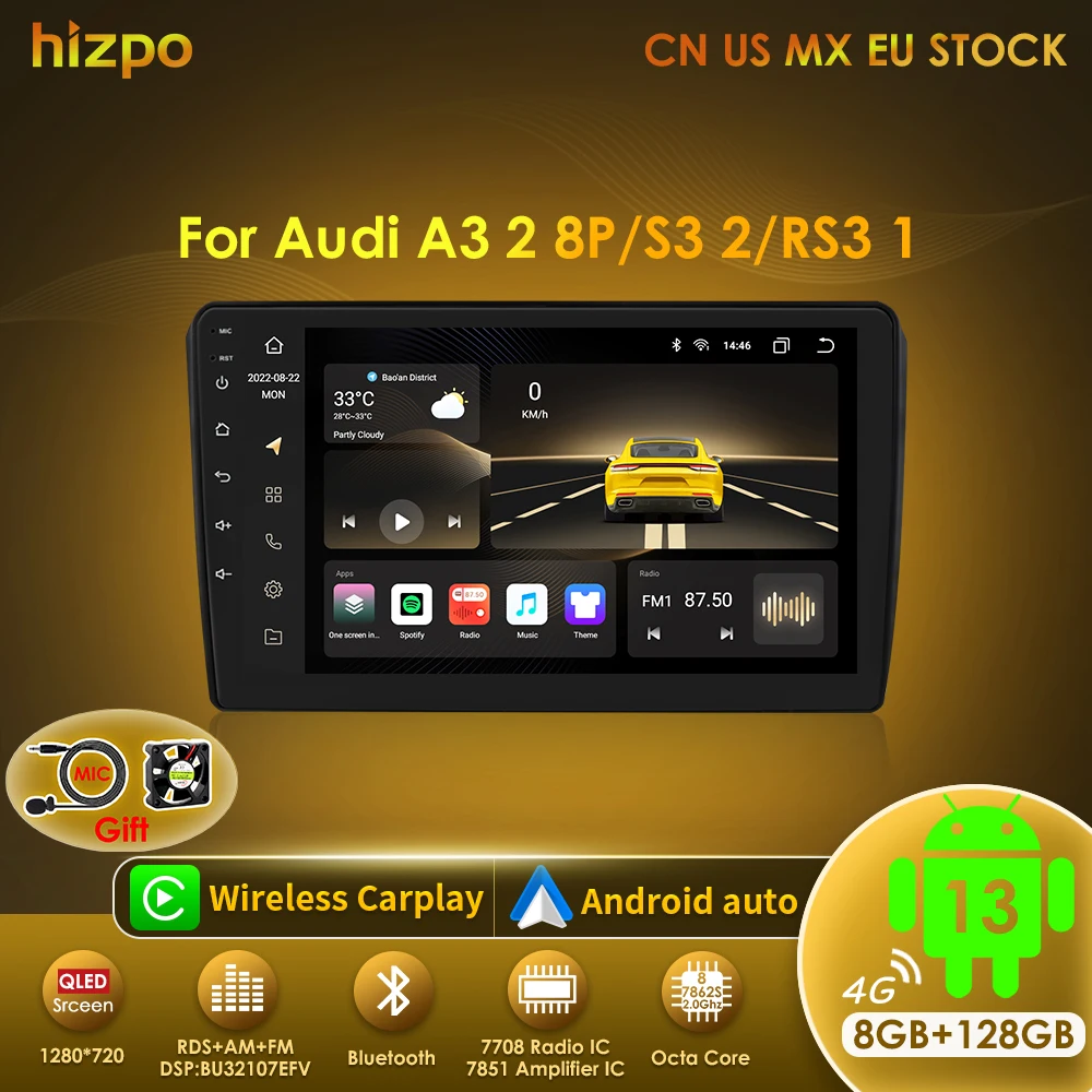 Hizpo 9 Inch Car Radio 2 Din Android 13 Stereo With Screen For Audi A3 8P 2003-2012 Carplay Intelligent System Multimedia Wifi