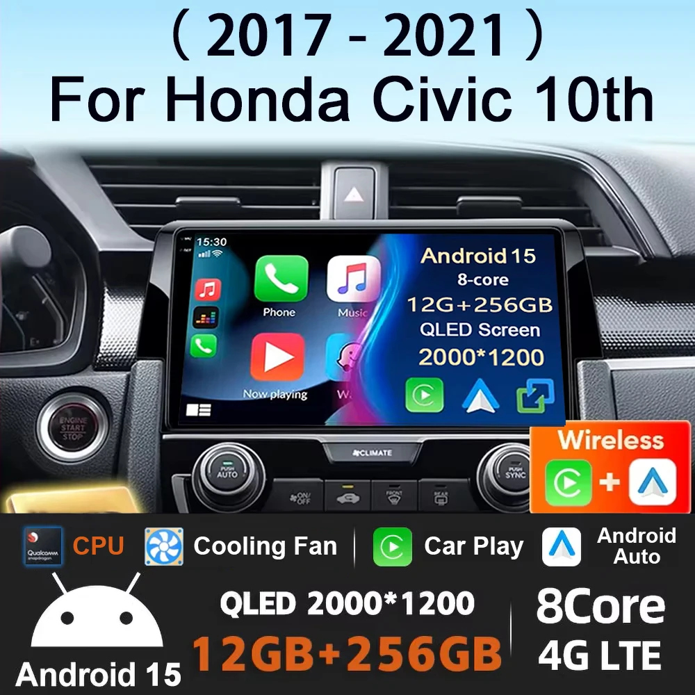 For Honda Civic 10th 2016 2017 2018 2019-2021 Android 15 Carplay Auto Car Radio Multimedia Video Player Navigation GPS 4G WIFI