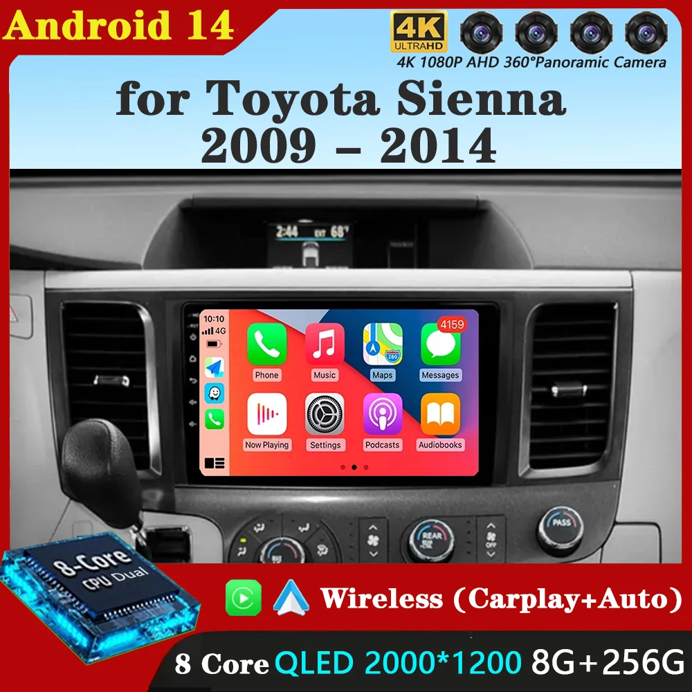 Android14 for Toyota Sienna 2009 2010 2011 2012 2013 2014 Car Radio Navigation Multimedia Player Stereo GPS WiFi+4G Carplay+Auto