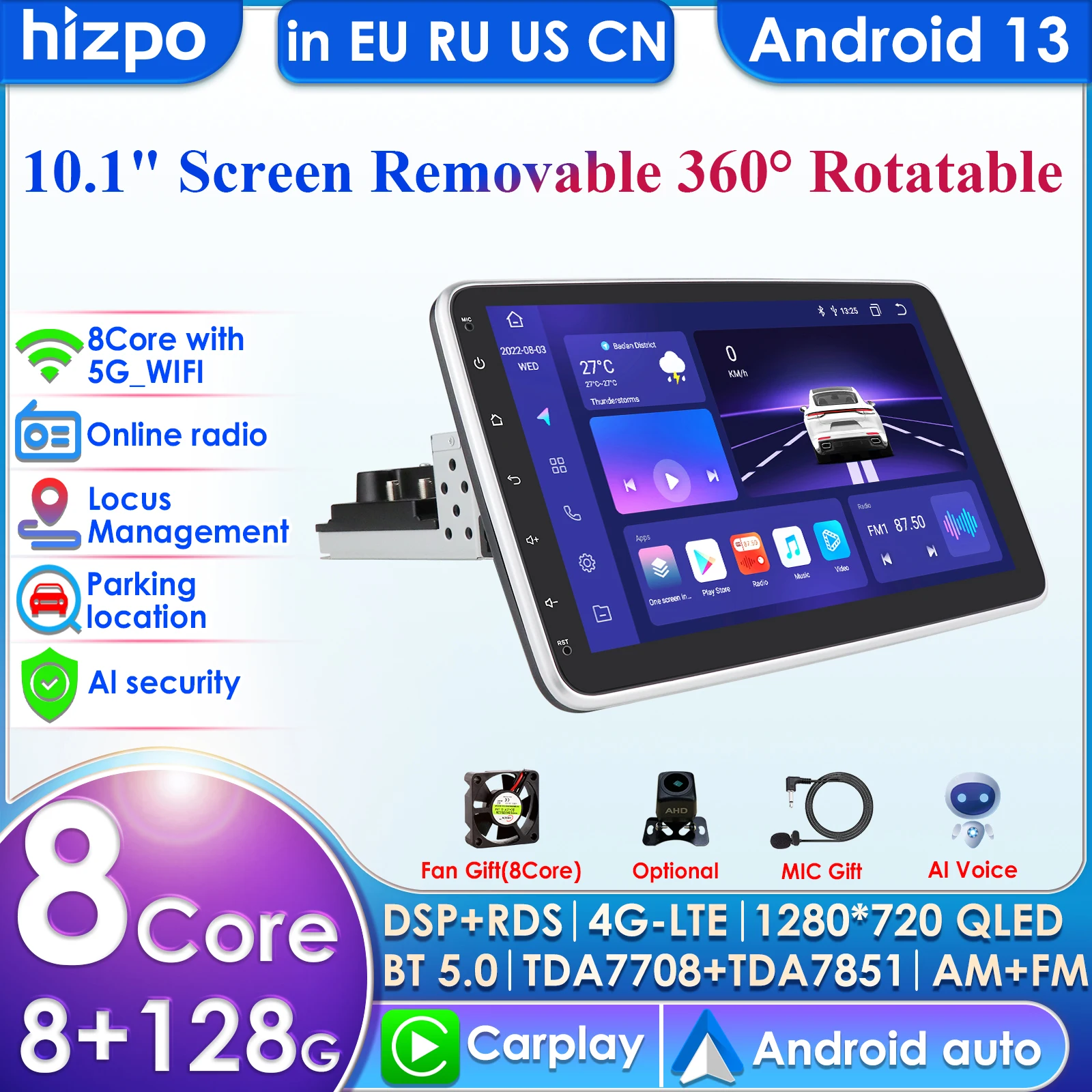 1 Din Android Auto Audio Car Stereo Video Multimidia Radio Player 10.1 Inch Universal Autoradio GPS Wifi Rotatable Touch Screen