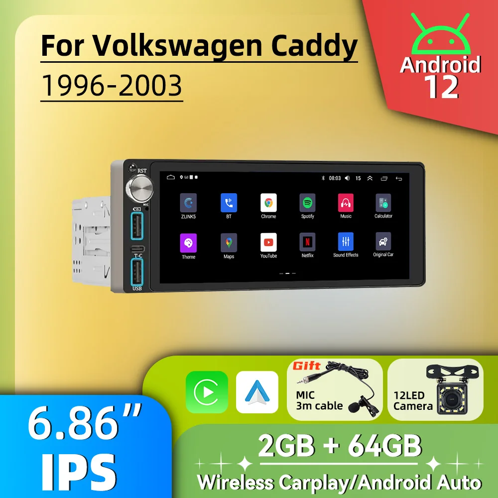 Wireless Carplay Autoradio 6.86" 1Din Radio Android Car Multimedia for VW Volkswagen Caddy 1996-2003 Stereo Head Unit GPS Wifi