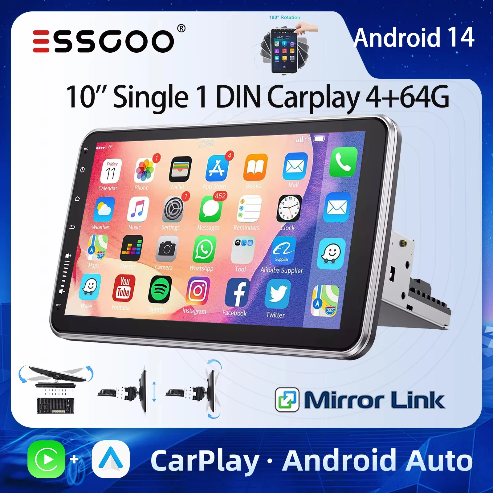 ESSGOO 10" Android 14 4+64G Wireless Carplay Android Auto Car Stereo Radio 1 DIN GPS Navi BT FM RDS WIFI USB EQ SWC w/ Microphoe