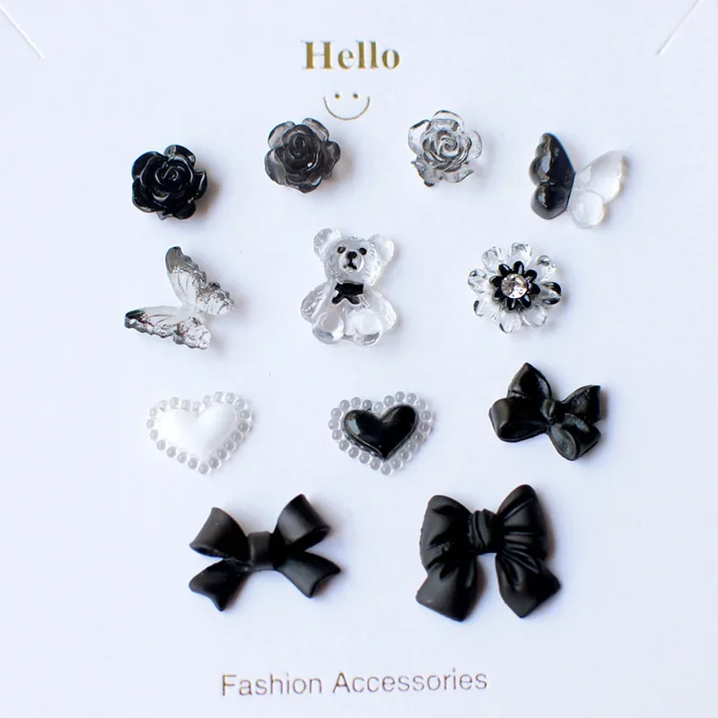 10PCS Supply Kawaii 3D Black Color Mini Bow Flower Bear Love Heart Small Resin Nail Art Accessories Decoration Charms