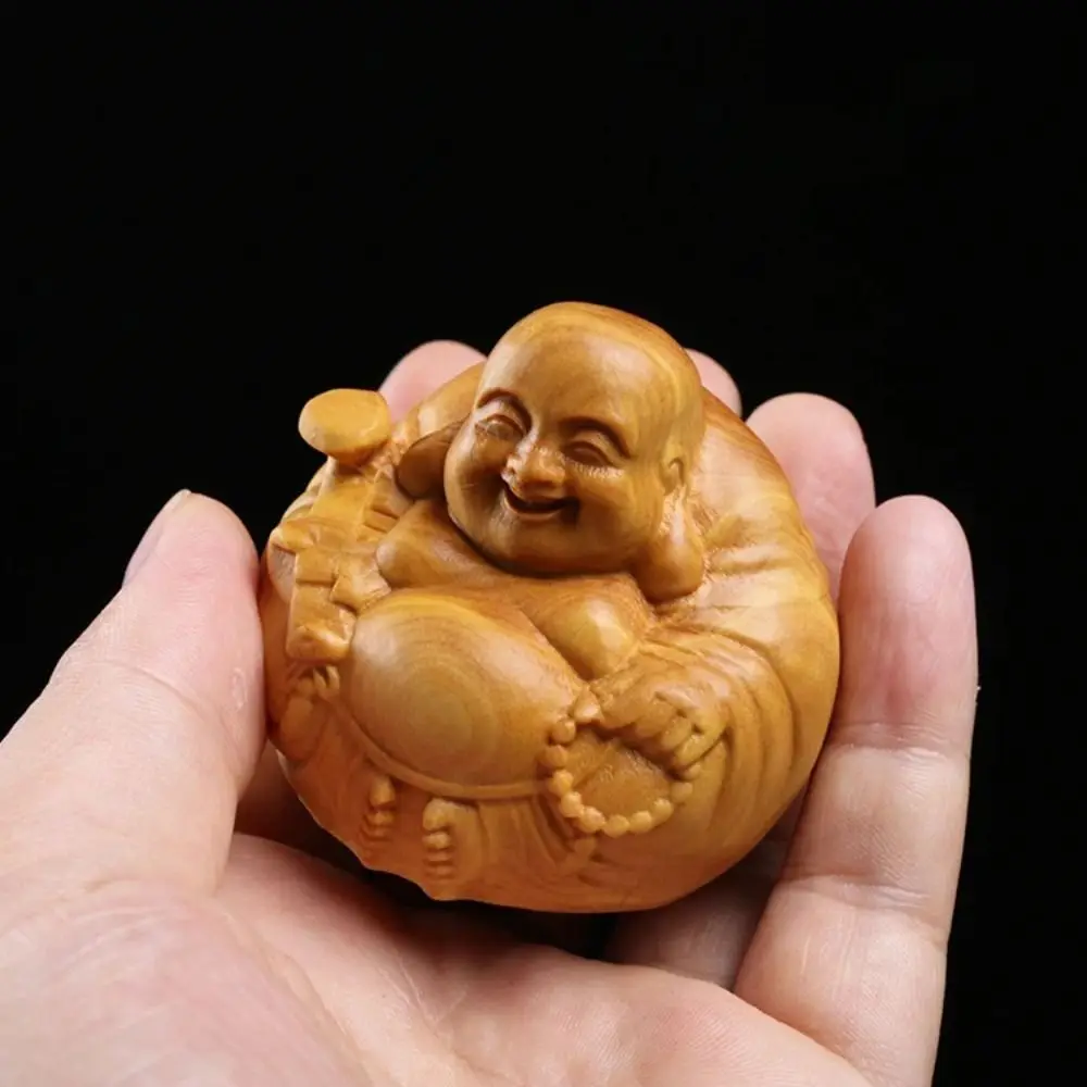 Desktop Ornaments Woodcarving Laughing Buddha Maitreya Sculpture Mini Wooden Buddha Statue Craft Miniature Handmade Statue Gift
