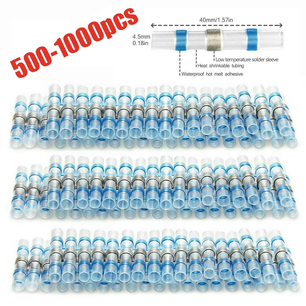 500/1000PCS Waterproof Solder Seal Sleeve Splice Terminal Tinned Copper Heat Shrink Electrical Wire Butt Connector AWG16-14 Blue
