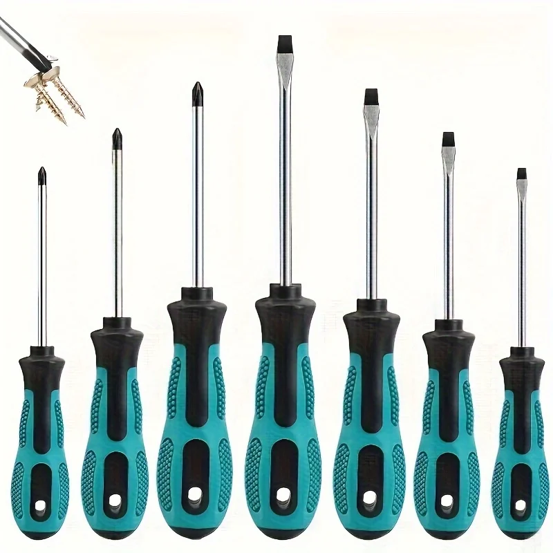 1 set Screwdriver Set with Magnetic Tip, Chrome Vanadium Steel, Phosphated Gold Tip and Flat Tip, Non-Slip Grip