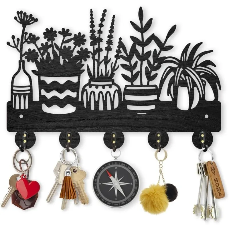 1 Set Potted Plant Coat Hooks Wall Mount Wood Flower Pot Key Holder for Wall 11.8×7.9inch 5 Alloy Hooks Black Key Rack