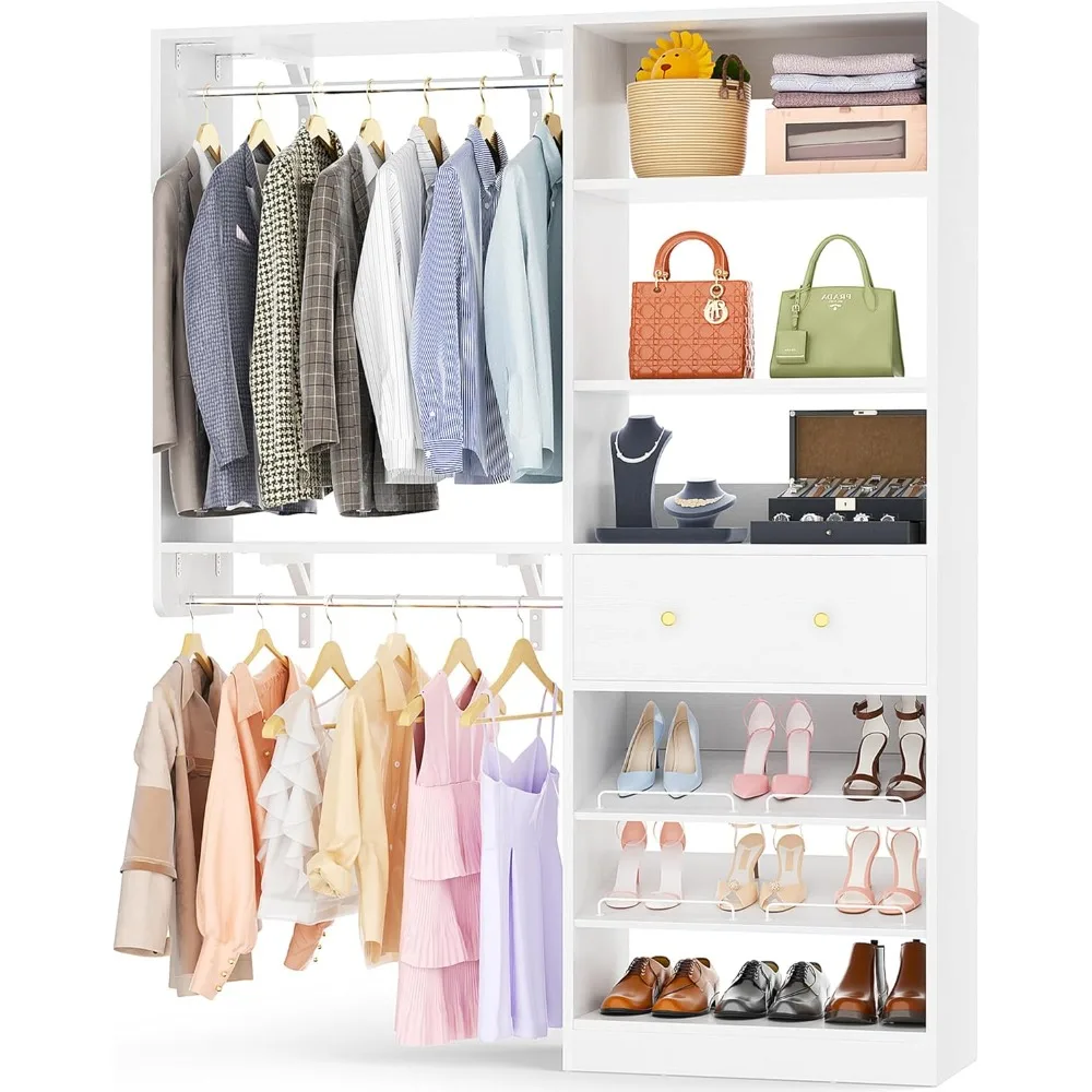 Closet System with Drawer - Reversible 5FT Wood Closet Organizer System with 2 Hanging Rods and Adjustable Shelf, Walk In Closet