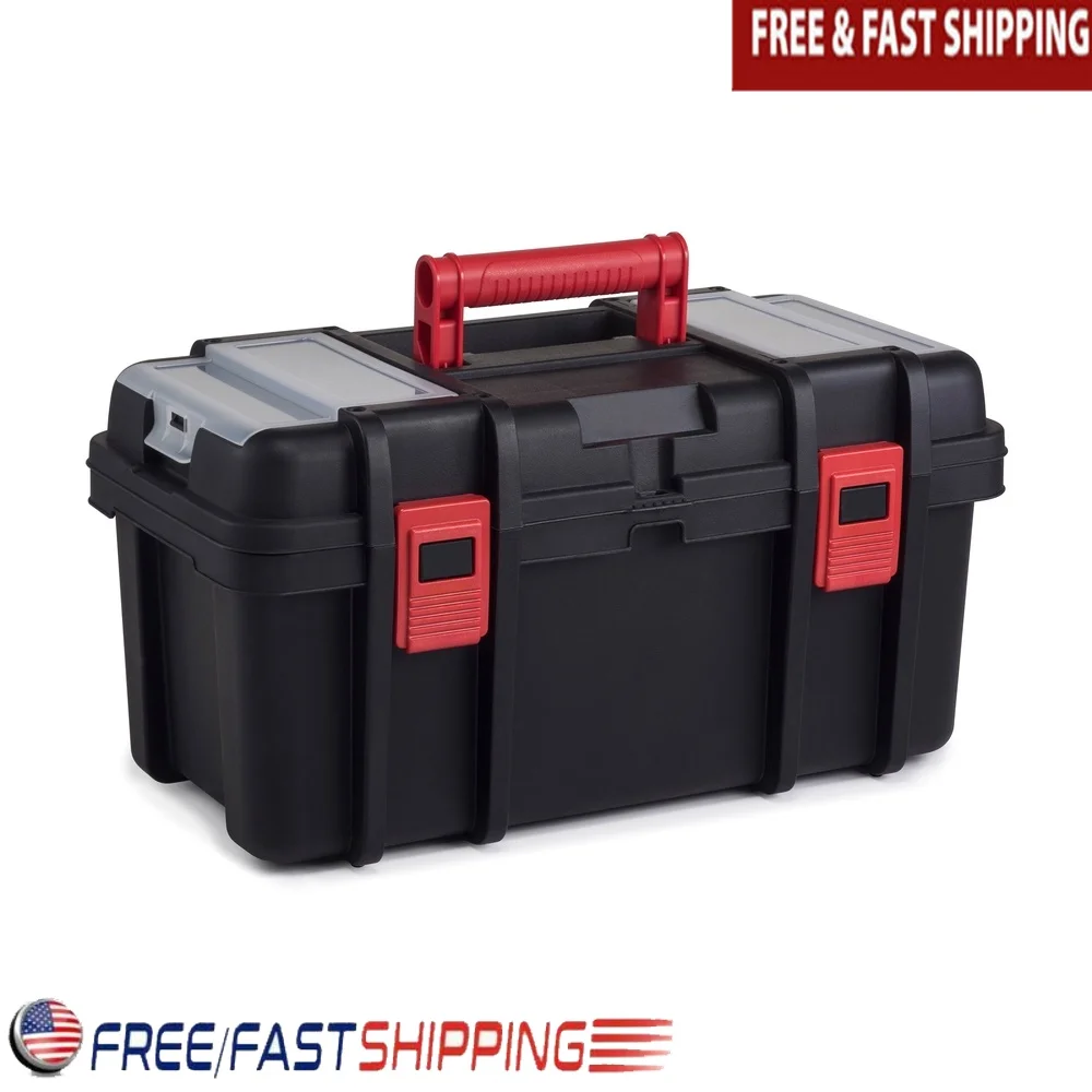 19 Inch Toolbox Heavy Duty Plastic Tool Storage Portable with Removable Tray Lid Organizers Metal Lid Stopper Padlock Eye