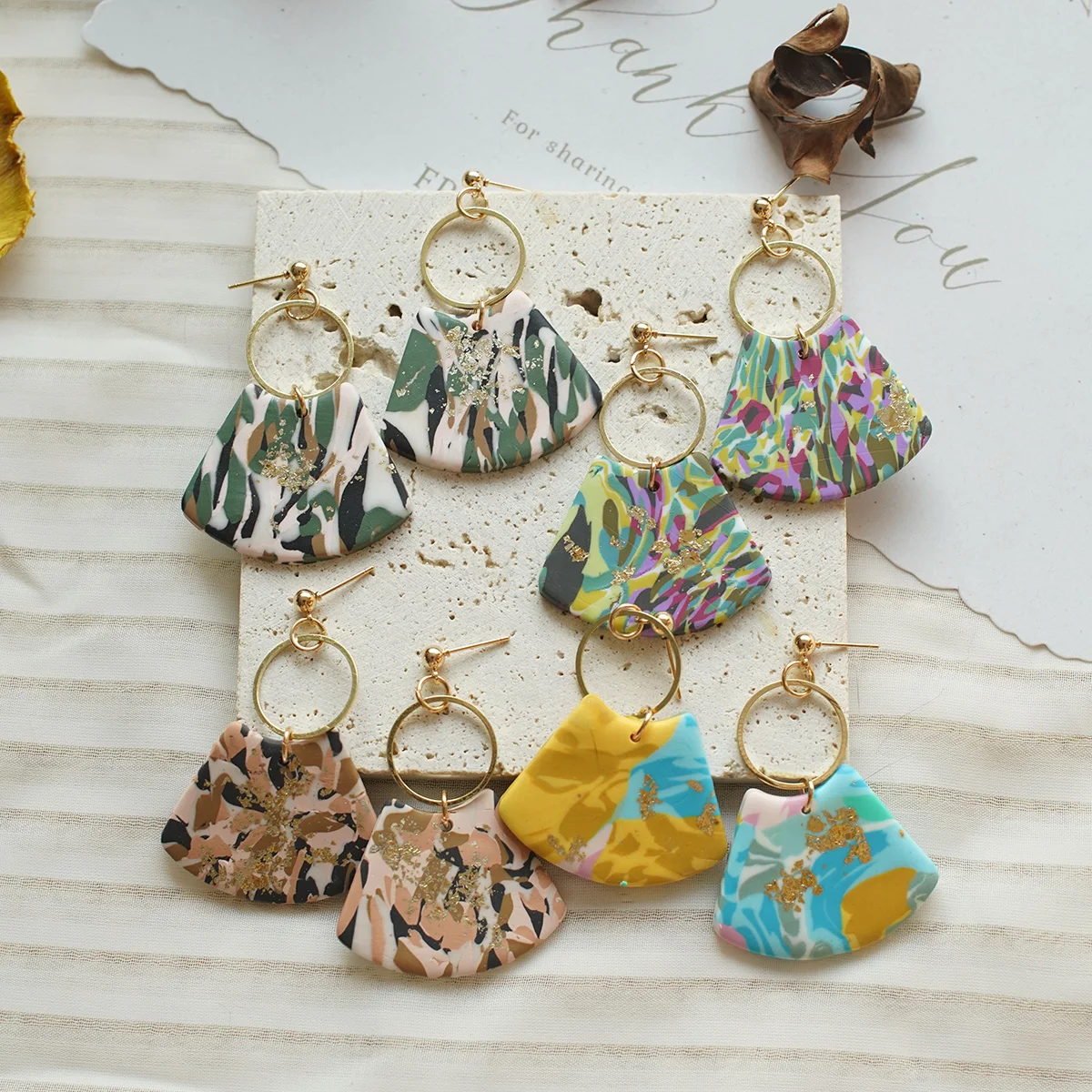 Pop Fashion Multi Colors Marble Pattern Shield Shape with Brass Ring Dangle Drop Polymer Clay Earrings Women's Accessories Daily