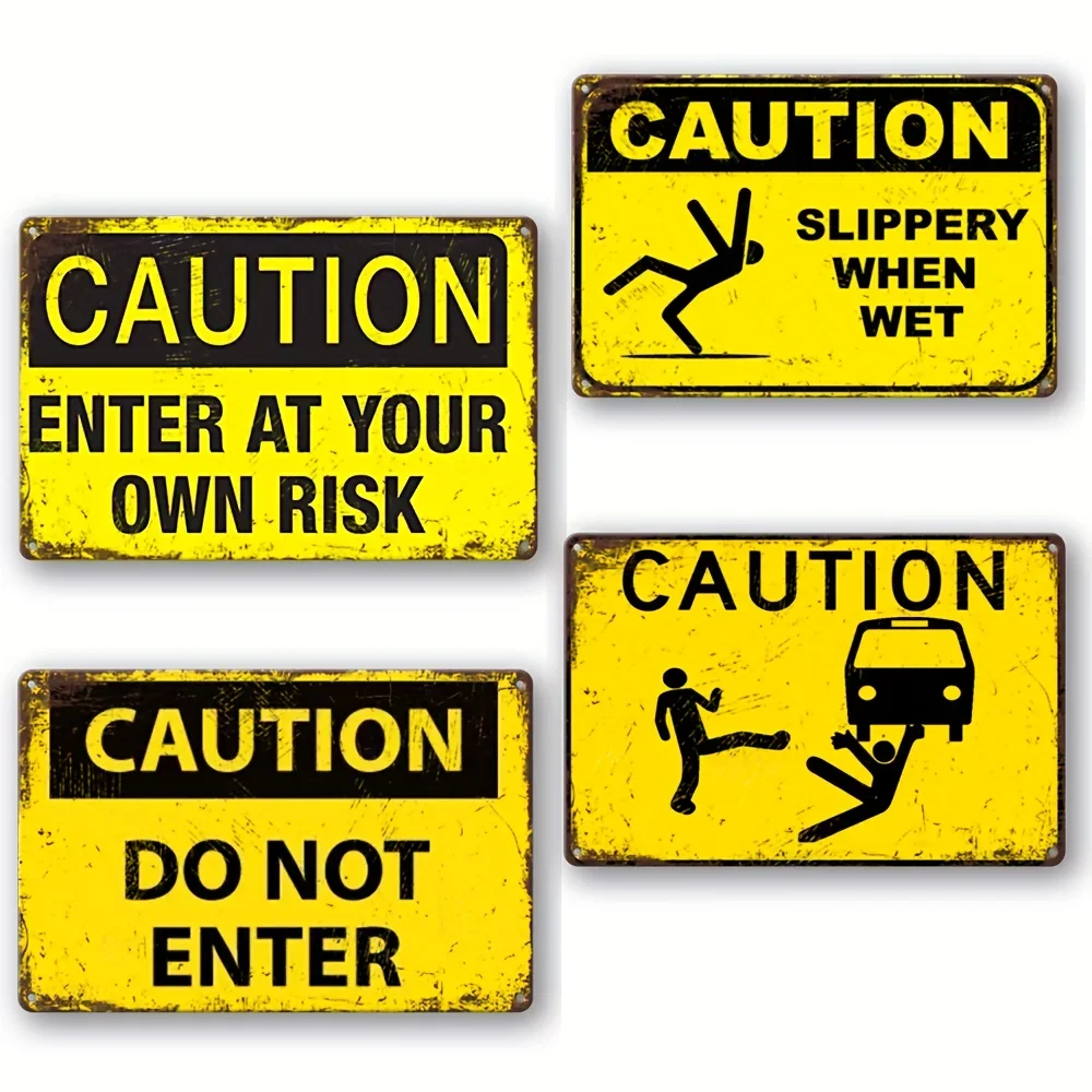 Vintage Metal Warning Tin Sign, Caution Enter At Your Own Risk/ Slippery Shen Wet/Do Not Enter, Room Home Restaurant Garage Decor
