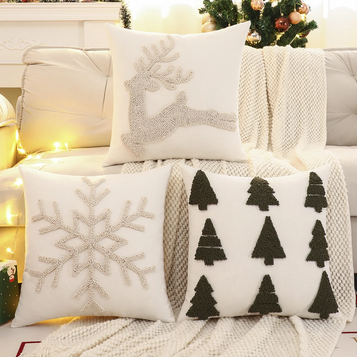 1 PC Christmas Decoration Throw Pillow Cover Embroidery Canvas Tufted Snowflake Reindeer