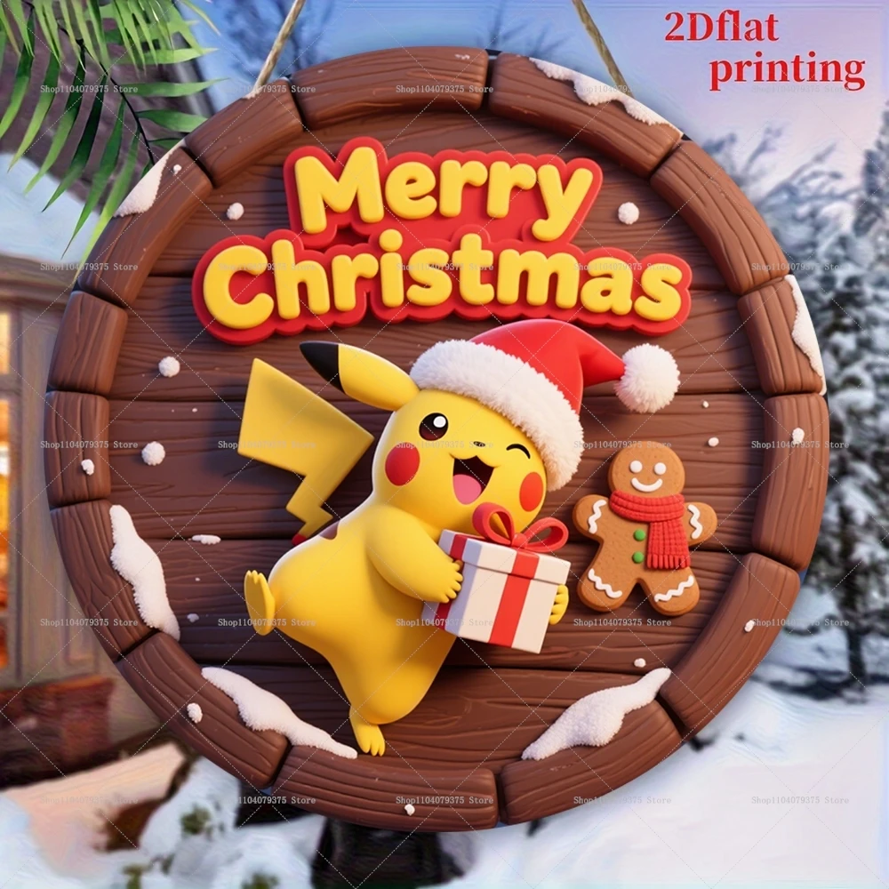 1Pc Merry Christmas Pikachu Logo Personalized Round Wooden Hanging Sign Front Door Wall Holiday Celebration Decoration